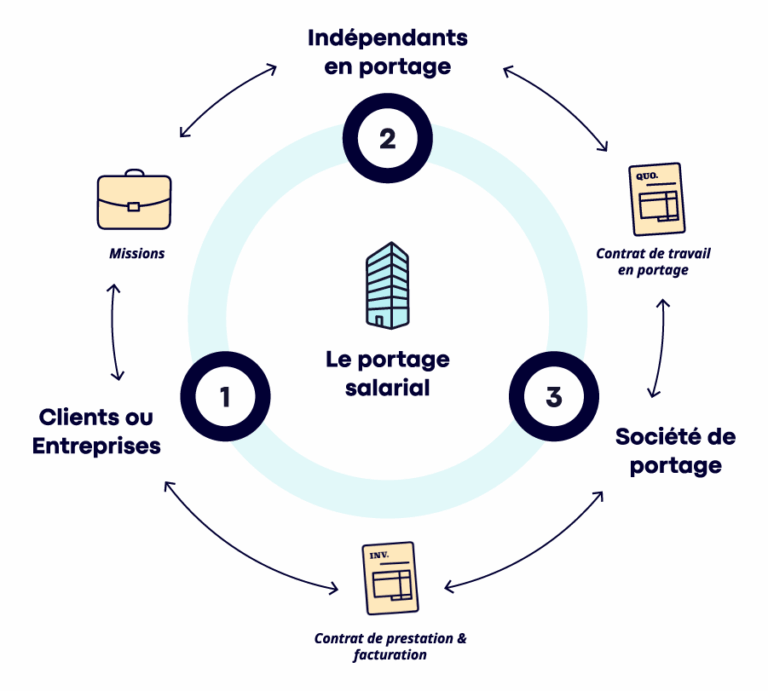 Le portage salarial repose sur un schéma tripartite. Le consultant prospecte ses clients, négocie ses prestations et réalise les missions en toute autonomie. La société de portage, de son côté, facture ces missions et transforme les honoraires en salaire après déduction des frais de gestion et des cotisations sociales. Enfin, l’entreprise cliente bénéficie des services du consultant sans avoir à gérer un contrat de travail classique.